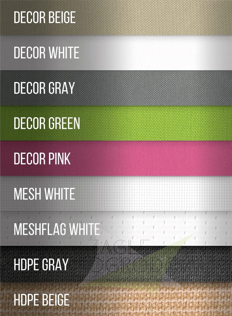 - Material Premium Decor 200 g/m² in den Farben Weiß, Beige, Grau und Grün für die Herstellung von: hochwertigen wasserdichten Segeln, Raffrollos, Schiebesegeln, Vorhängen, Balkonabdeckungen, Tipizelten und Kocoonhängematten
