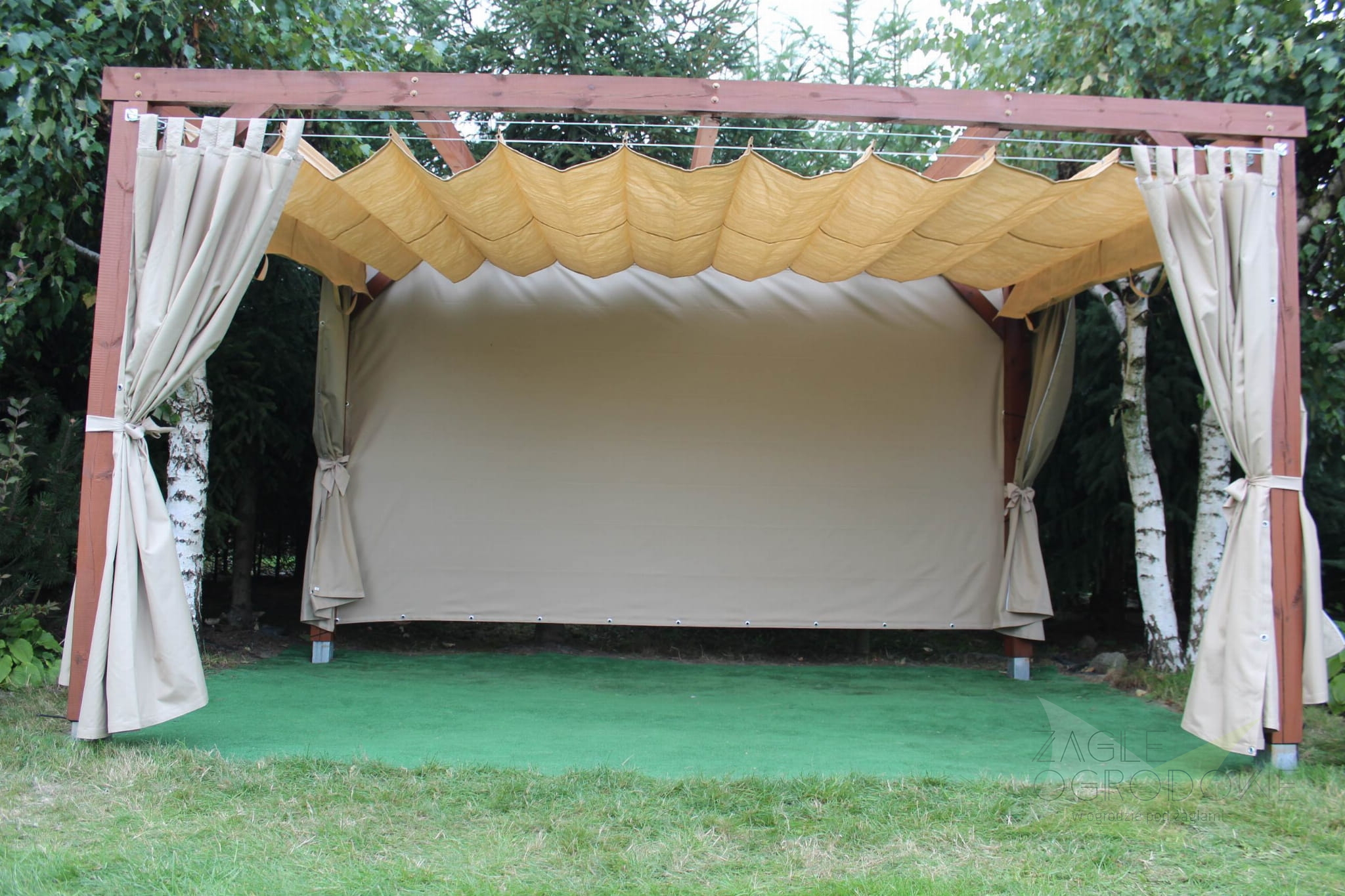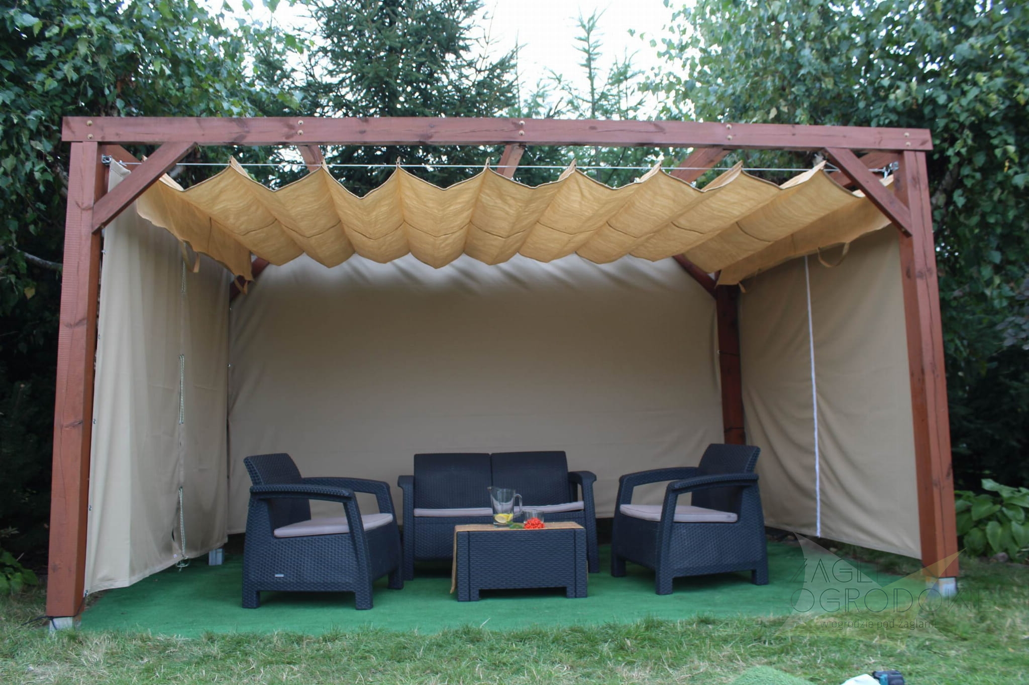 Las persianas horizontales de material PEAD de 285 g / m² están hechas de volantes colgando 25cm . Se realizan costuras horizontales cada 50 cm junto con túneles horizontales en los que se insertan tubos de aluminio para endurecer la estructura. La cortina enrollable está acabada con volantes que también protegen del sol poniente . Todo se desarma con la ayuda de asas cosidas al principio y al final de la tela.