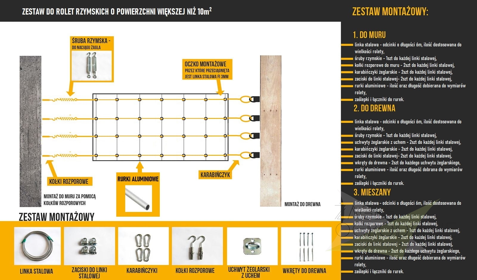 - Puede elegir un kit de montaje (opcional): hasta 5m² MINI kit, hasta 10m² PEQUEÑO, más de 10m² kit GRANDE.
