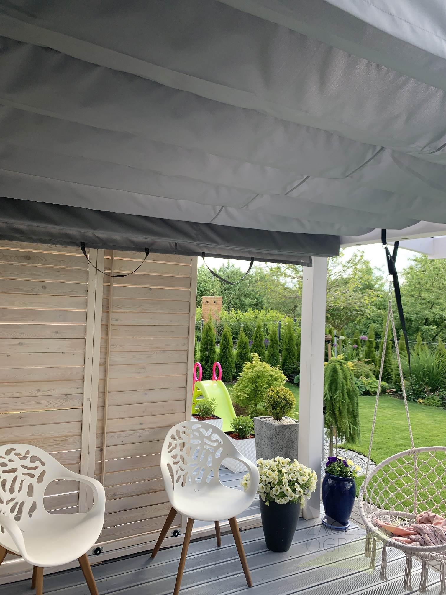 Las cubiertas para jardín de invierno están hechas de un material resistente de primera calidad - decor 200g/m², que protege del sol y la luz lluvia. Composición de la tela: 100% poliéster. Las persianas están hechas con volantes que cuelgan de 25cm. Se realizan costuras horizontales cada 50 cm junto con túneles horizontales en los que se insertan tubos de aluminio para endurecer la estructura. Las persianas enrollables están acabadas con volantes, que también protegen contra el sol poniente. Todo se separa mediante asas cosidas al principio y al final de la tela.