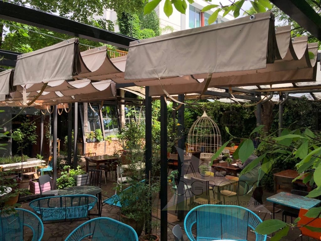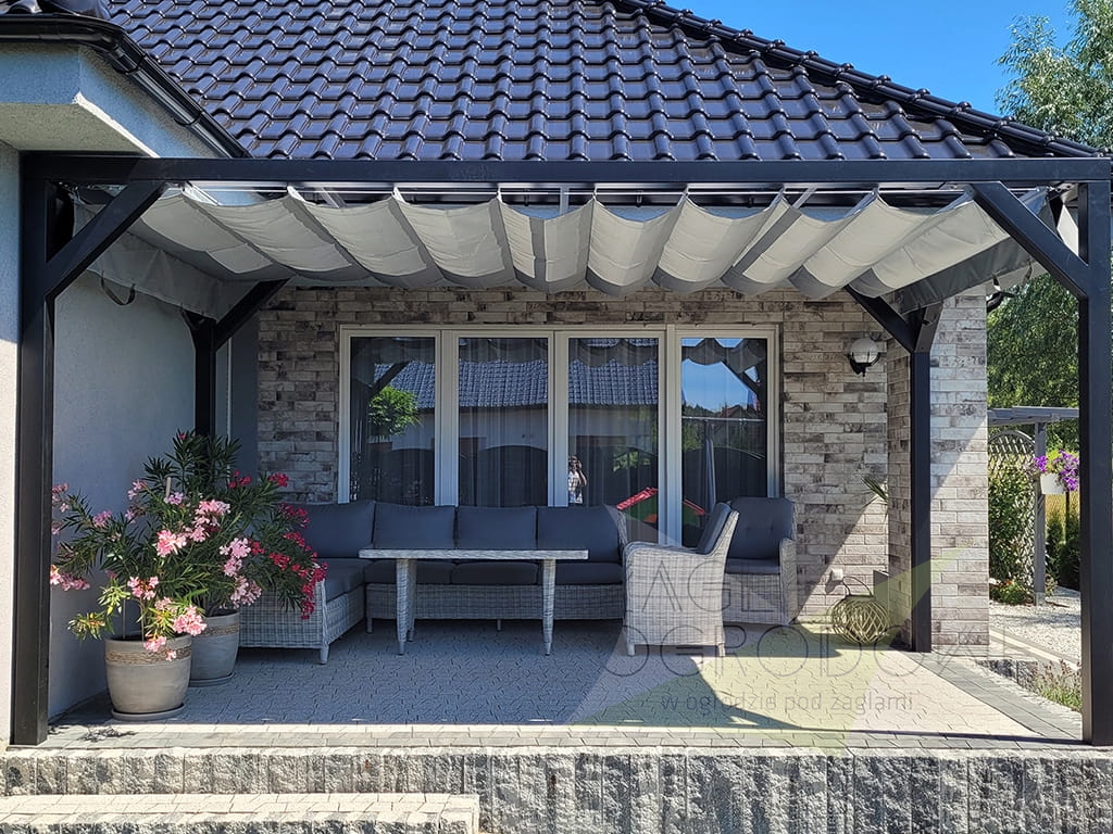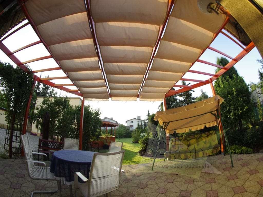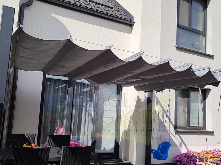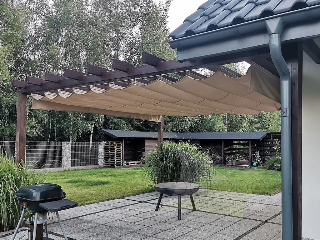 Las persianas horizontales se elaboran en un resistente tejido decorativo de calidad superior de 200 g/m² que protege del sol y lluvia ligera (composición: 100% poliéster). Los toldos disponen de pliegues de 25 cm. Las costuras horizontales se distribuyen cada 50 cm, con canales horizontales que alojan tubos de aluminio para dar rigidez a la estructura. Además, la persiana tiene faldones que protegen del sol al atardecer. El toldo se extiende mediante asas situadas en los extremos de la tela.