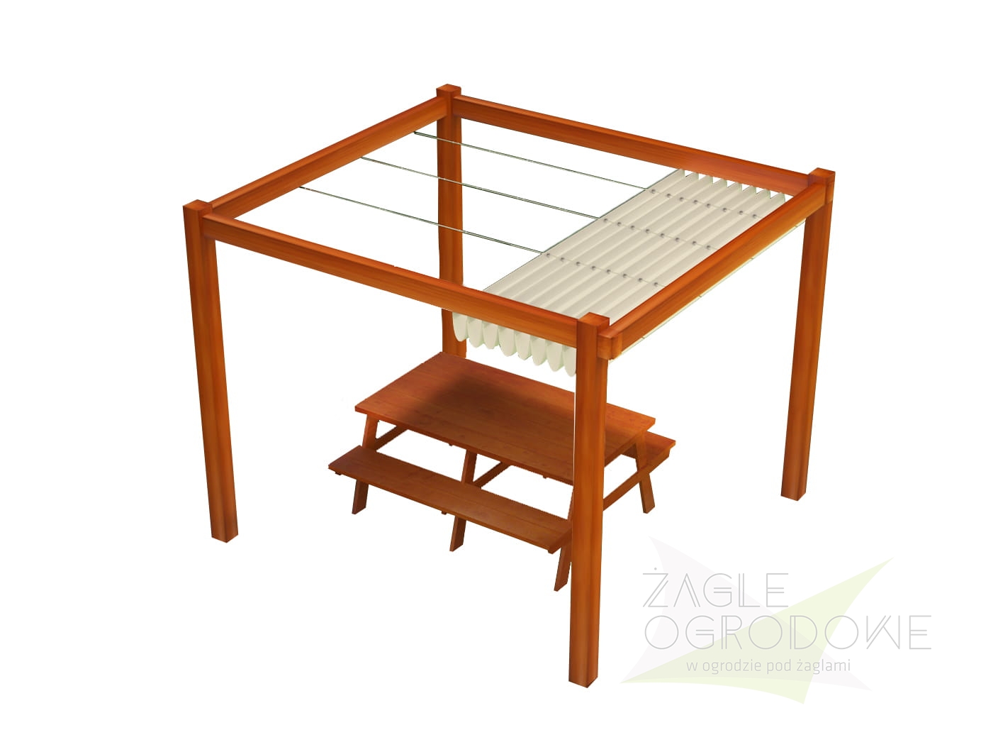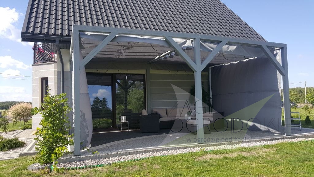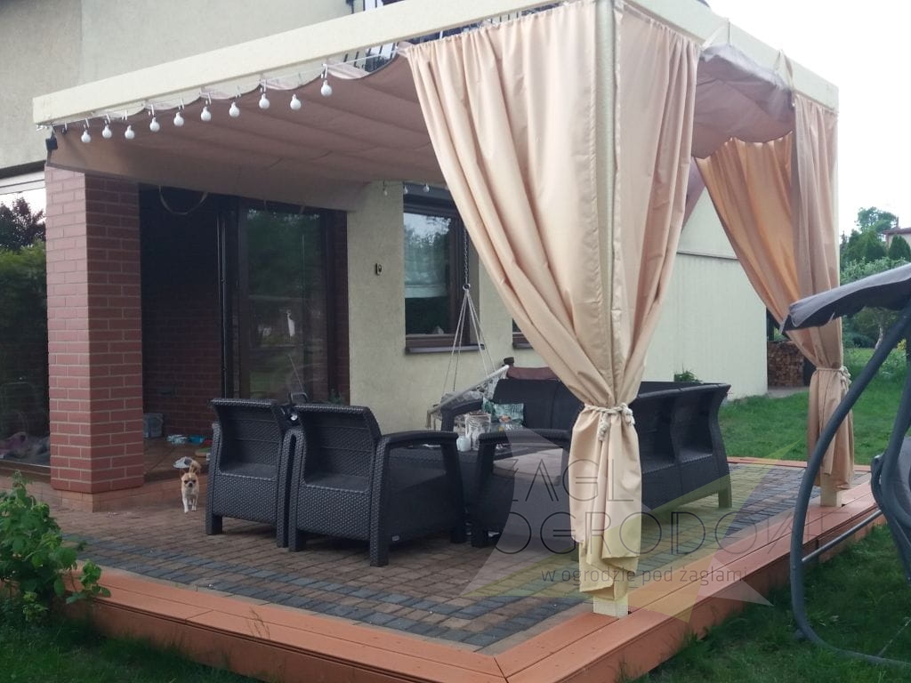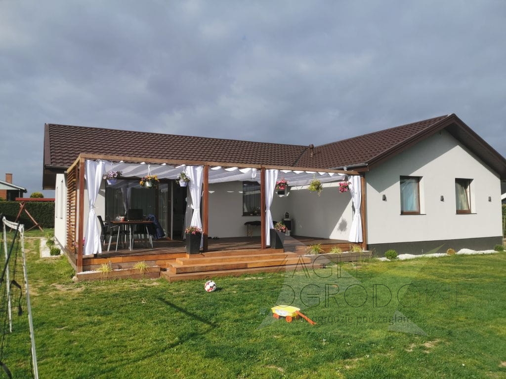 Las persianas horizontales se elaboran en un resistente tejido decorativo de calidad superior de 200 g/m² que protege del sol y lluvia ligera (composición: 100% poliéster). Los toldos disponen de pliegues de 25 cm. Las costuras horizontales se distribuyen cada 50 cm, con canales horizontales que alojan tubos de aluminio para dar rigidez a la estructura. Además, la persiana tiene faldones que protegen del sol al atardecer. El toldo se extiende mediante asas situadas en los extremos de la tela.